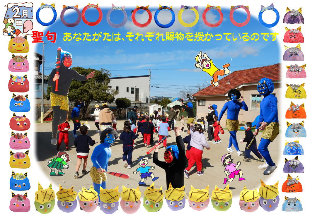 節分のまめまきをしました。泣き虫鬼やイヤイヤ鬼を追い出すことができたかな?鬼が怖くて涙の出たおともだち、鬼が消防署のやさしいお兄さんだと わかると、みんなニッコリでした。